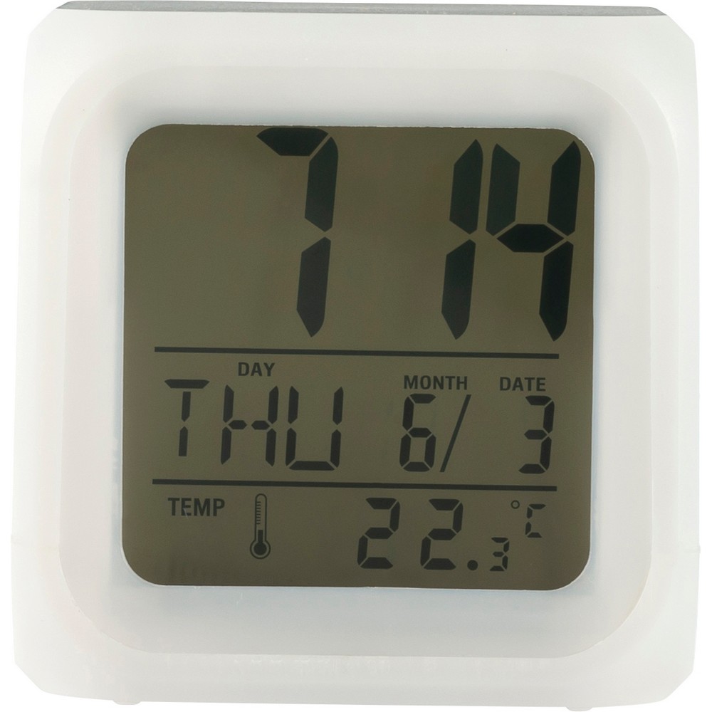 Entdecken Sie die Tischuhr in Premium-Qualität – der ideale Imageträger für Ihr Unternehmen. Mit kompakten Abmessungen von 7,8 x 7,8 x 7,8 cm und einem Gewicht von nur 86 g ist sie nicht nur praktisch, sondern auch ein stilvolles Accessoire für jedes Büro. Die Uhr vereint Funktionalität mit einem modernen Design: Sie zeigt nicht nur die Zeit, sondern auch Temperatur und Datum, und verfügt über einen praktischen Alarm.