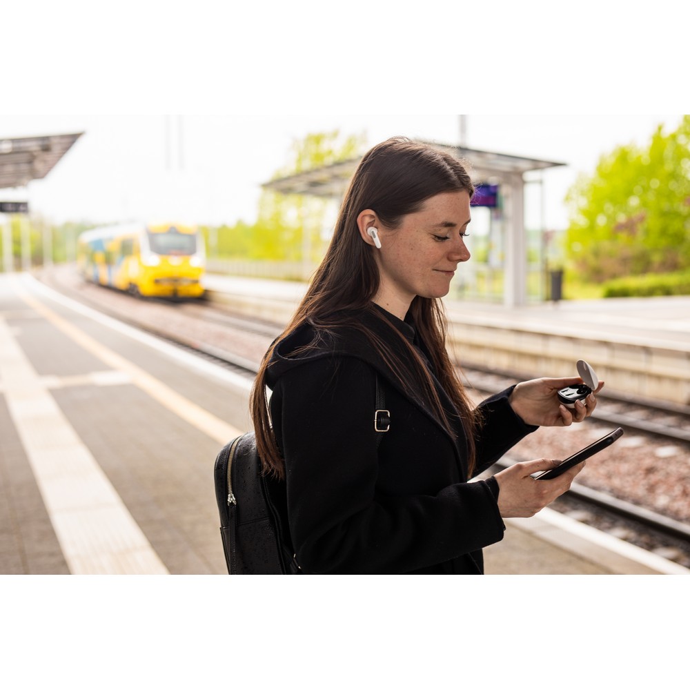 Jeder Kopfhörer bietet eine Spielzeit von ca. 2 Stunden und wird sicher im stilvollen Ladegerät mit digitalem Display aufbewahrt. Mit einer Reichweite von bis zu 10 m haben Ihre Kunden die Freiheit, Musik zu genießen und Anrufe zu tätigen, ohne abgelenkt zu werden.